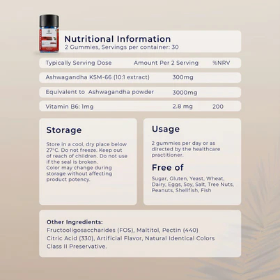 A mixture of glucose syrup, sucrose, water, maltodextrin, ashwagandha extract (10:1), pectin (pectin, sugar), apple juice concentrate, citric acid (acidity regulator), sodium citrate (acidity regulator), natural flavor, surface treatment agents (vegetable oil, carnauba wax), black carrot juice concentrate, and vitamin B6 (pyridoxine hydrochloride).